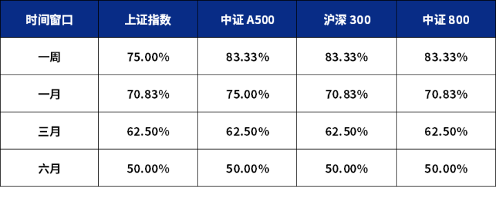表:八连阳后不同时间区间内主要指数收益为正的概率