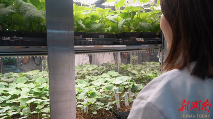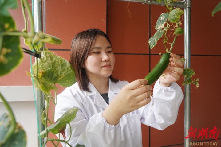 “这是我们通过分子育种技术改良后的油亮型黄瓜。”湖南农业大学园艺学院教授郝宁小心翼翼地摘下一个小黄瓜,向记者展示。
