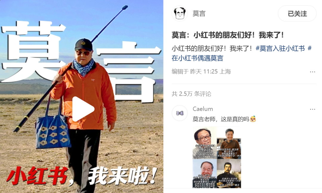 “小红书优股平台,我来了。”11月11日上午,著名作家莫言在小红书上发布首条视频。